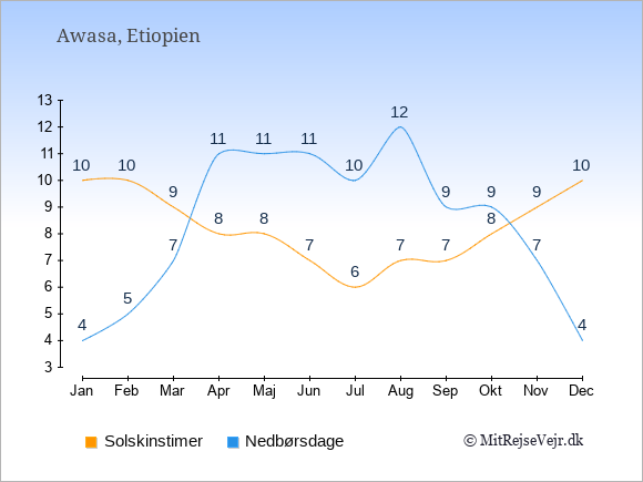 Graferne viser det gennemsnitlige antal solskinstimer i Awasa pr. dag samt det gennemsnitlige antal dage med nedbør i Awasa sammenlignet med København.