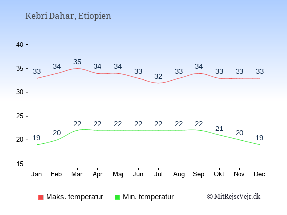 Graferne viser de gennemsnitlige maksimale temperaturer i Kebri Dahar og København (typisk når solen står højest på himmelen om eftermiddagen) og de gennemsnitlige minimale temperaturer (typisk den laveste temperatur som måles om natten).