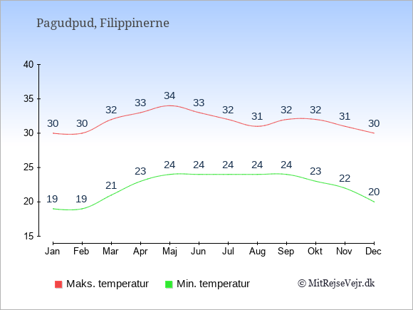 Graferne viser de gennemsnitlige maksimale temperaturer i Pagudpud og København (typisk når solen står højest på himmelen om eftermiddagen) og de gennemsnitlige minimale temperaturer (typisk den laveste temperatur som måles om natten).