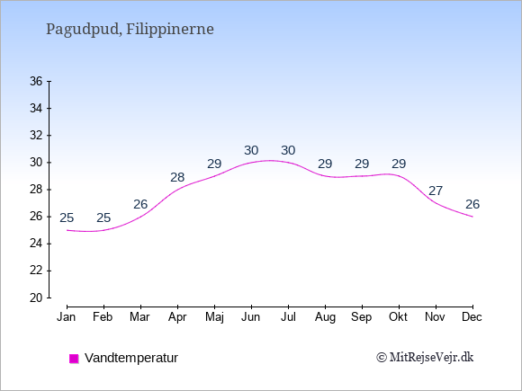Her på siden kan du få et samlet overblik over det gennemsnitlige klima i Pagudpud måned for måned sammenlignet med klimaet i København. Oplysningerne om det historiske klima kan du bruge til at planlægge din ferie og finde det bedste tidspunkt at rejse til Pagudpud på.