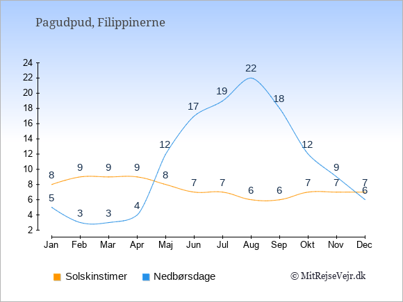 Graferne viser det gennemsnitlige antal solskinstimer i Pagudpud pr. dag samt det gennemsnitlige antal dage med nedbør i Pagudpud sammenlignet med København.