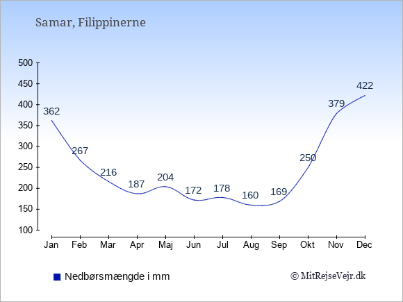 Se klimadata for Samar sammenlignet med klimaet i Danmark.