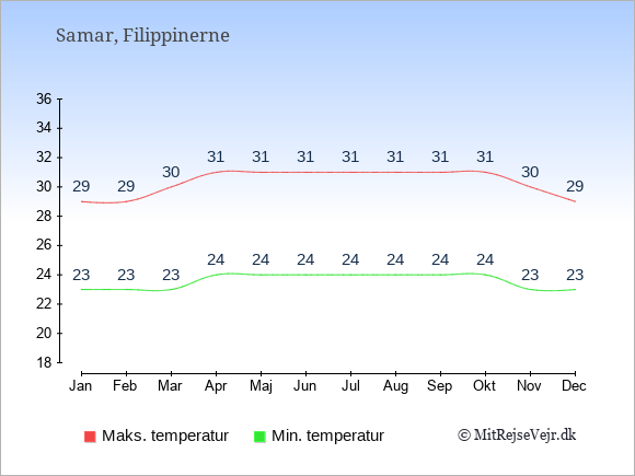 Graferne viser de gennemsnitlige maksimale temperaturer på Samar og i København (typisk når solen står højest på himmelen om eftermiddagen) og de gennemsnitlige minimale temperaturer (typisk den laveste temperatur som måles om natten).