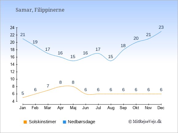 Graferne viser det gennemsnitlige antal solskinstimer på Samar pr. dag samt det gennemsnitlige antal dage med nedbør på Samar sammenlignet med København.