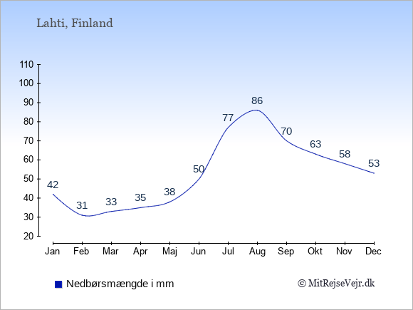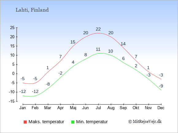 Her på siden kan du få et samlet overblik over det gennemsnitlige klima i Lahti måned for måned sammenlignet med klimaet i København. Oplysningerne om det historiske klima kan du bruge til at planlægge din ferie og finde det bedste tidspunkt at rejse til Lahti på.
