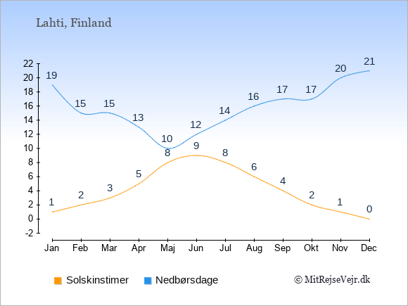 Graferne viser det gennemsnitlige antal solskinstimer i Lahti pr. dag samt det gennemsnitlige antal dage med nedbør i Lahti sammenlignet med København.