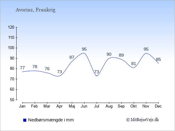 Her på siden kan du få et samlet overblik over det gennemsnitlige klima i Avoriaz måned for måned sammenlignet med klimaet i København. Oplysningerne om det historiske klima kan du bruge til at planlægge din ferie og finde det bedste tidspunkt at rejse til Avoriaz på.