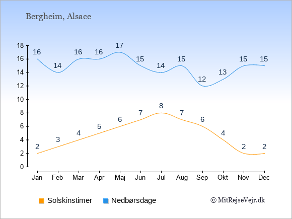 Graferne viser det gennemsnitlige antal solskinstimer i Bergheim pr. dag samt det gennemsnitlige antal dage med nedbør i Bergheim sammenlignet med København.