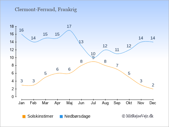Graferne viser det gennemsnitlige antal solskinstimer i Clermont-Ferrand pr. dag samt det gennemsnitlige antal dage med nedbør i Clermont-Ferrand sammenlignet med København.