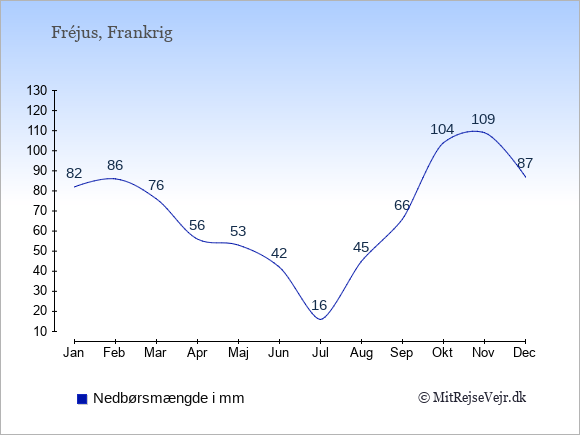 Se klimadata for Fréjus sammenlignet med klimaet i Danmark.