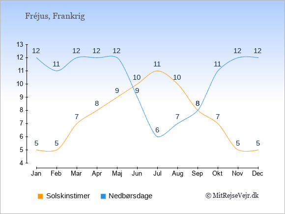 Graferne viser det gennemsnitlige antal solskinstimer i Fréjus pr. dag samt det gennemsnitlige antal dage med nedbør i Fréjus sammenlignet med København.