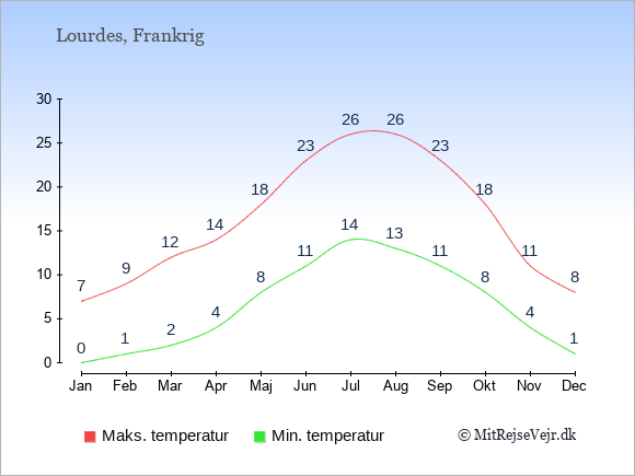 Graferne viser de gennemsnitlige maksimale temperaturer i Lourdes og København (typisk når solen står højest på himmelen om eftermiddagen) og de gennemsnitlige minimale temperaturer (typisk den laveste temperatur som måles om natten).
