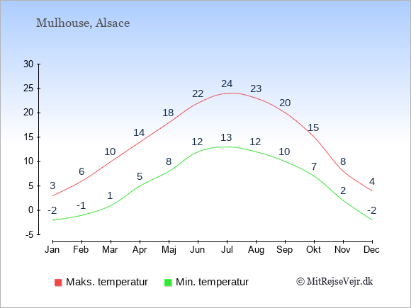 Graferne viser de gennemsnitlige maksimale temperaturer i Mulhouse og København (typisk når solen står højest på himmelen om eftermiddagen) og de gennemsnitlige minimale temperaturer (typisk den laveste temperatur som måles om natten).
