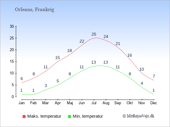 Graferne viser de gennemsnitlige maksimale temperaturer i Orleans og København (typisk når solen står højest på himmelen om eftermiddagen) og de gennemsnitlige minimale temperaturer (typisk den laveste temperatur som måles om natten).