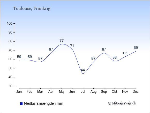 Skal man ud og rejse, har Toulouse det bedste klima i de måneder, hvor der er mange solskinstimer og få nedbørsdage.