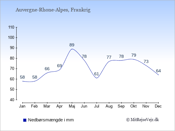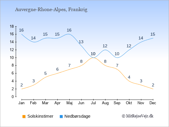 Grafen viser antallet af solskinstimer i Auvergne-Rhone-Alpes (d.v.s. det gennemsnitlige antal timer pr. dag hvor solen skinner), samt antallet af nedbørsdage (d.v.s. det gennemsnitlige antal dage i en given måned,