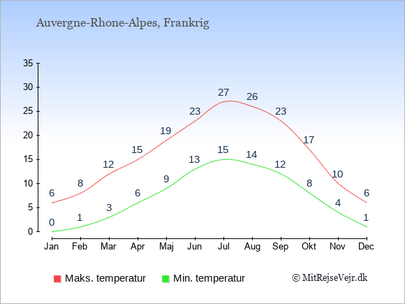 Grafen viser de gennemsnitlige maksimale temperaturer i Auvergne-Rhone-Alpes (som oftest den værdi, der er målt midt på dagen) og de gennemsnitlige minimale temperaturer (som oftest den værdi, der er målt midt om natten).