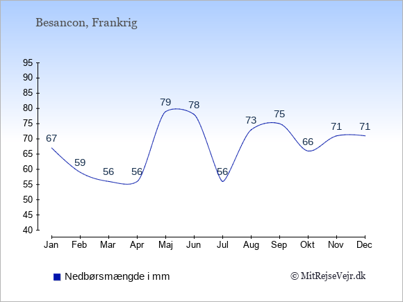 Grafen viser de gennemsnitlige maksimale temperaturer i Besancon (som oftest den værdi, der er målt midt på dagen) og de gennemsnitlige minimale temperaturer (som oftest den værdi, der er målt midt om natten).