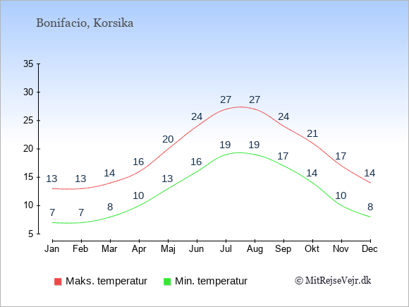 Grafen viser de gennemsnitlige maksimale temperaturer i Bonifacio (som oftest den værdi, der er målt midt på dagen) og de gennemsnitlige minimale temperaturer (som oftest den værdi, der er målt midt om natten).