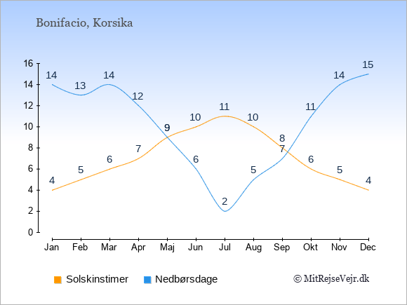 Grafen viser antallet af solskinstimer i Bonifacio (d.v.s. det gennemsnitlige antal timer pr. dag hvor solen skinner), samt antallet af nedbørsdage (d.v.s. det gennemsnitlige antal dage i en given måned,