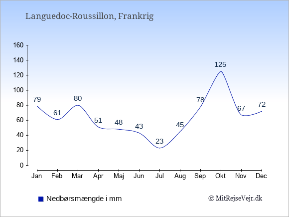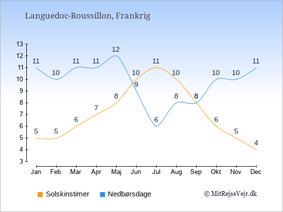 Grafen viser antallet af solskinstimer i Languedoc-Roussillon (d.v.s. det gennemsnitlige antal timer pr. dag hvor solen skinner), samt antallet af nedbørsdage (d.v.s. det gennemsnitlige antal dage i en given måned,