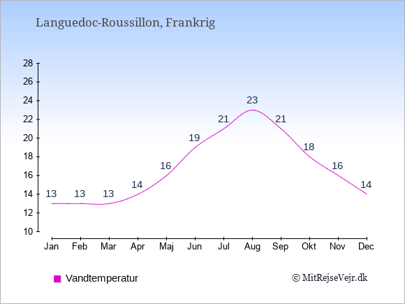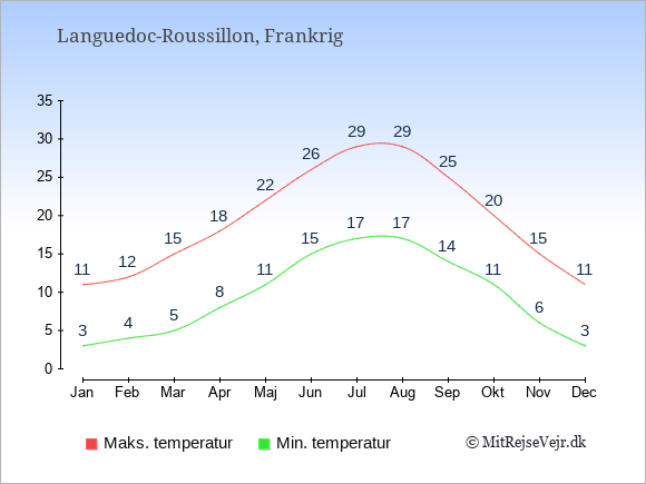 Grafen viser de gennemsnitlige maksimale temperaturer i Languedoc-Roussillon (som oftest den værdi, der er målt midt på dagen) og de gennemsnitlige minimale temperaturer (som oftest den værdi, der er målt midt om natten).