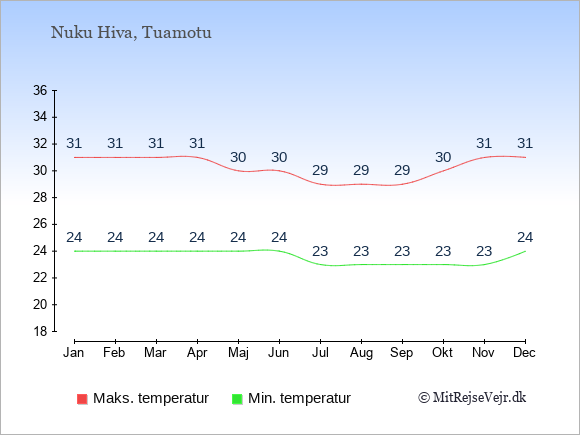 Graferne viser de gennemsnitlige maksimale temperaturer på Nuku Hiva og i København (typisk når solen står højest på himmelen om eftermiddagen) og de gennemsnitlige minimale temperaturer (typisk den laveste temperatur som måles om natten).