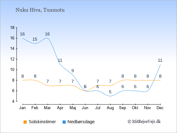 Graferne viser det gennemsnitlige antal solskinstimer på Nuku Hiva pr. dag samt det gennemsnitlige antal dage med nedbør på Nuku Hiva sammenlignet med København.