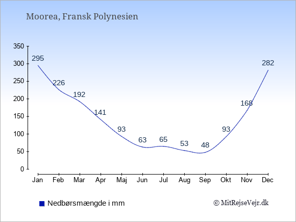 Vejret på Moorea: Solskinstimer og nedbørsdage