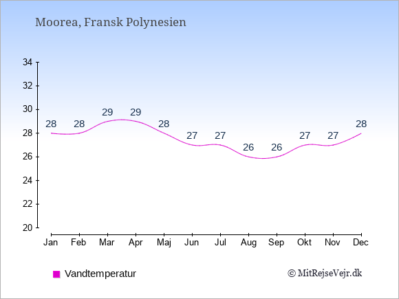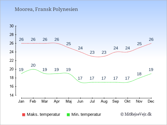 Grafen viser de gennemsnitlige maksimale temperaturer på Moorea (som oftest den værdi, der er målt midt på dagen) og de gennemsnitlige minimale temperaturer (som oftest den værdi, der er målt midt om natten).