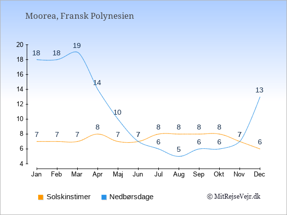 Grafen viser antallet af solskinstimer på Moorea (d.v.s. det gennemsnitlige antal timer pr. dag hvor solen skinner), samt antallet af nedbørsdage (d.v.s. det gennemsnitlige antal dage i en given måned,