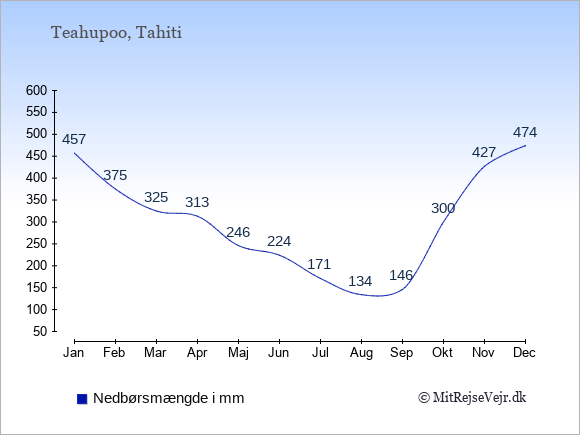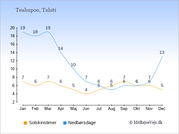 Grafen viser antallet af solskinstimer i Teahupoo (d.v.s. det gennemsnitlige antal timer pr. dag hvor solen skinner), samt antallet af nedbørsdage (d.v.s. det gennemsnitlige antal dage i en given måned,