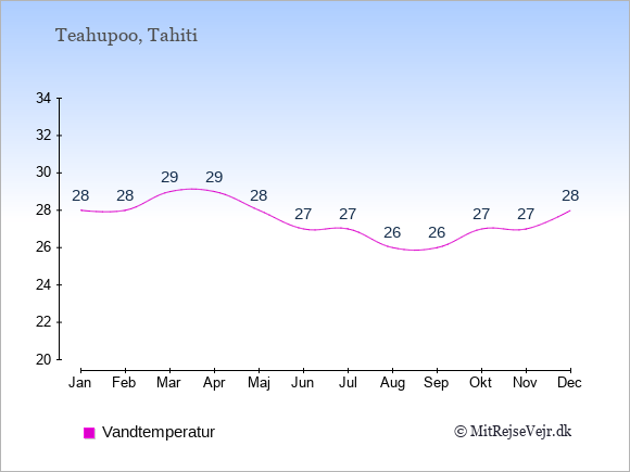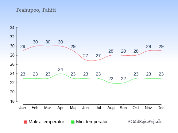 Grafen viser de gennemsnitlige maksimale temperaturer i Teahupoo (som oftest den værdi, der er målt midt på dagen) og de gennemsnitlige minimale temperaturer (som oftest den værdi, der er målt midt om natten).