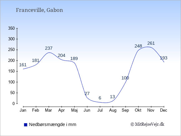 Se klimadata for Franceville sammenlignet med klimaet i Danmark.