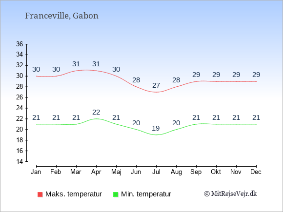 Graferne viser de gennemsnitlige maksimale temperaturer i Franceville og København (typisk når solen står højest på himmelen om eftermiddagen) og de gennemsnitlige minimale temperaturer (typisk den laveste temperatur som måles om natten).