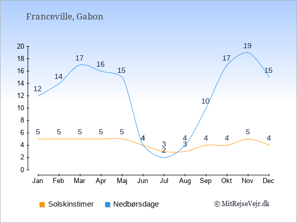 Graferne viser det gennemsnitlige antal solskinstimer i Franceville pr. dag samt det gennemsnitlige antal dage med nedbør i Franceville sammenlignet med København.