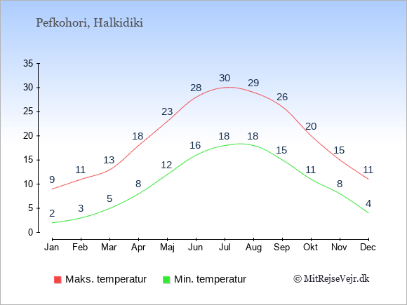 Graferne viser de gennemsnitlige maksimale temperaturer i Pefkohori og København (typisk når solen står højest på himmelen om eftermiddagen) og de gennemsnitlige minimale temperaturer (typisk den laveste temperatur som måles om natten).