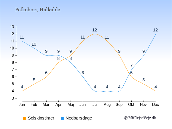 Graferne viser det gennemsnitlige antal solskinstimer i Pefkohori pr. dag samt det gennemsnitlige antal dage med nedbør i Pefkohori sammenlignet med København.