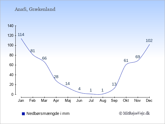 Vejret på Anafi er som regel bedst i de måneder, hvor der er mange solskinstimer og få nedbørsdage.