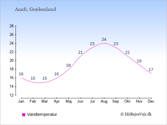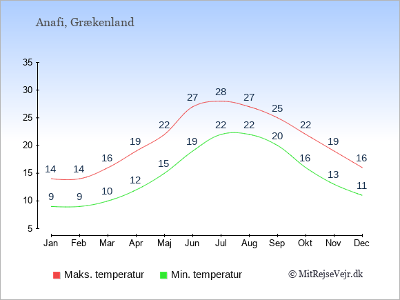 Grafen viser de gennemsnitlige maksimale temperaturer på Anafi (som oftest den værdi, der er målt midt på dagen) og de gennemsnitlige minimale temperaturer (som oftest den værdi, der er målt midt om natten).