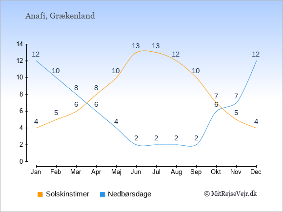 Grafen viser antallet af solskinstimer på Anafi (d.v.s. det gennemsnitlige antal timer pr. dag hvor solen skinner), samt antallet af nedbørsdage (d.v.s. det gennemsnitlige antal dage i en given måned,