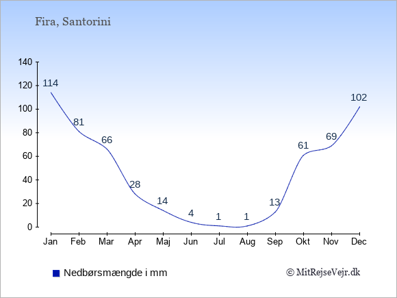 Hvis du vil se, hvordan vejret i Fira adskiller sig fra vejret derhjemme, kan du sammenligne tallene måned for måned med de tilsvarende tal for Danmark under Fira: klima & vejr.
