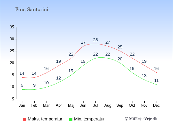 Grafen viser de gennemsnitlige maksimale temperaturer i Fira (som oftest den værdi, der er målt midt på dagen) og de gennemsnitlige minimale temperaturer (som oftest den værdi, der er målt midt om natten).