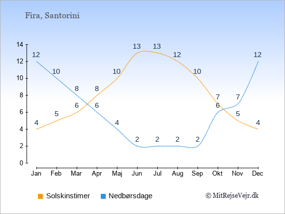 Grafen viser antallet af solskinstimer i Fira (d.v.s. det gennemsnitlige antal timer pr. dag hvor solen skinner), samt antallet af nedbørsdage (d.v.s. det gennemsnitlige antal dage i en given måned,