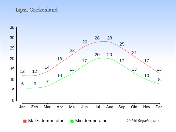 Grafen viser de gennemsnitlige maksimale temperaturer på Lipsi (som oftest den værdi, der er målt midt på dagen) og de gennemsnitlige minimale temperaturer (som oftest den værdi, der er målt midt om natten).