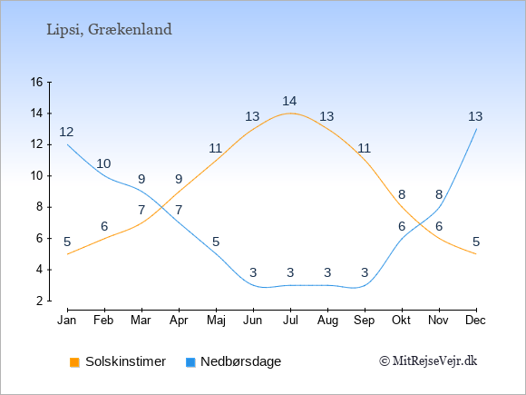 Grafen viser antallet af solskinstimer på Lipsi (d.v.s. det gennemsnitlige antal timer pr. dag hvor solen skinner), samt antallet af nedbørsdage (d.v.s. det gennemsnitlige antal dage i en given måned,