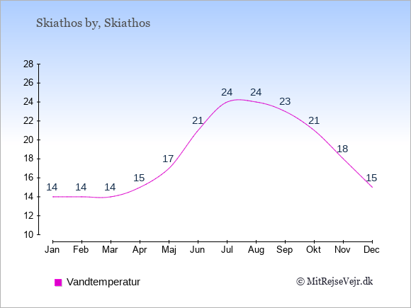 Grafen viser de gennemsnitlige maksimale temperaturer i Skiathos by (som oftest den værdi, der er målt midt på dagen) og de gennemsnitlige minimale temperaturer (som oftest den værdi, der er målt midt om natten).