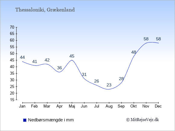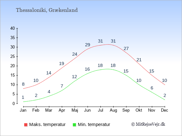 Grafen viser de gennemsnitlige maksimale temperaturer i Thessaloniki (som oftest den værdi, der er målt midt på dagen) og de gennemsnitlige minimale temperaturer (som oftest den værdi, der er målt midt om natten).