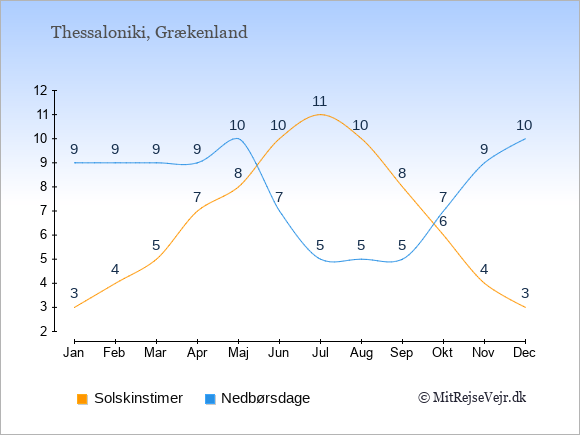 Grafen viser antallet af solskinstimer i Thessaloniki (d.v.s. det gennemsnitlige antal timer pr. dag hvor solen skinner), samt antallet af nedbørsdage (d.v.s. det gennemsnitlige antal dage i en given måned,