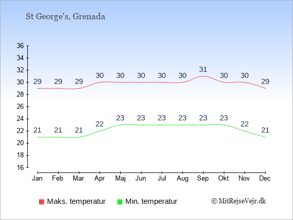 Graferne viser de gennemsnitlige maksimale temperaturer i St George's og København (typisk når solen står højest på himmelen om eftermiddagen) og de gennemsnitlige minimale temperaturer (typisk den laveste temperatur som måles om natten).